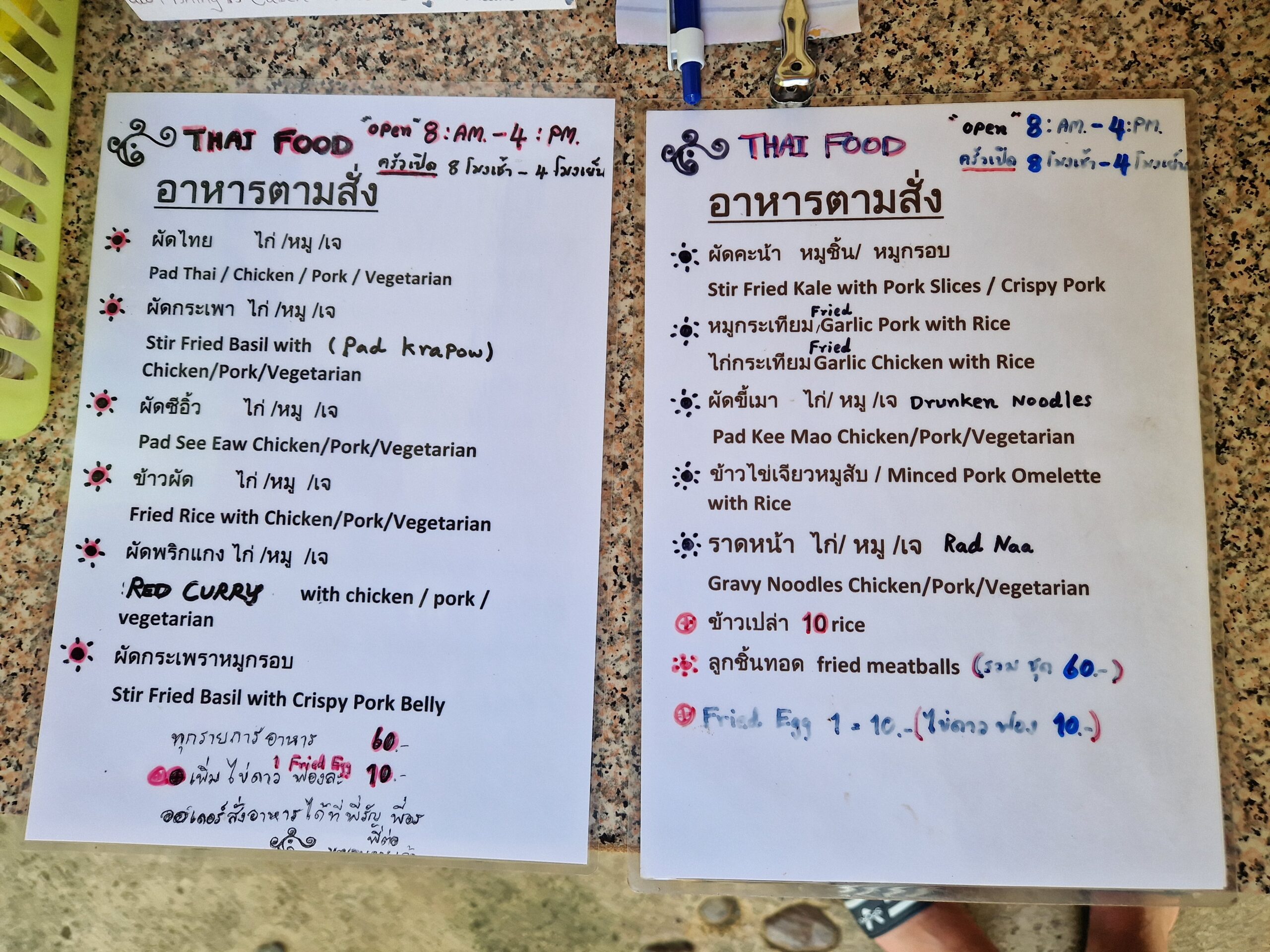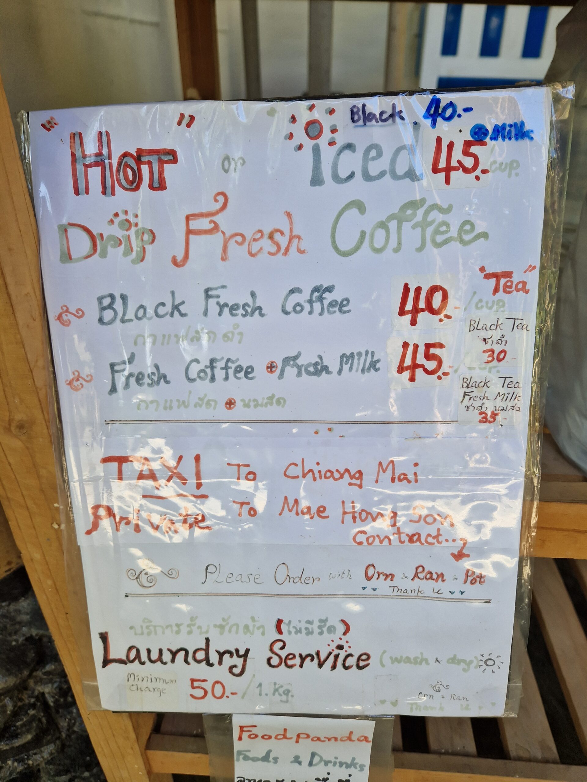 Indien je zelf niet kunt of wil koken dan kun je bij de eigenaren Ron en Orn ook Thaise maaltijden bestellen voor zo’n 60 tot 100 THB (~ 1.60 – 2.60 EUR). Afhankelijk van het seizoen is er gratis fruit (biologische bananen, papaja’s en mango’s) beschikbaar. Ook flessen water kun je gratis pakken in de keuken. Bij de receptie zijn ook verschillende drankje en snacks te koop, waaronder biologische eieren van scharrelkippen die op het terrein rondlopen. Heb je vuile was? Voor 50 THB (~ 1,30 EUR) per kilo is het de volgende dag heerlijk fris gewassen. Ook is er op de gehele accommodatie gratis WiFi beschikbaar.