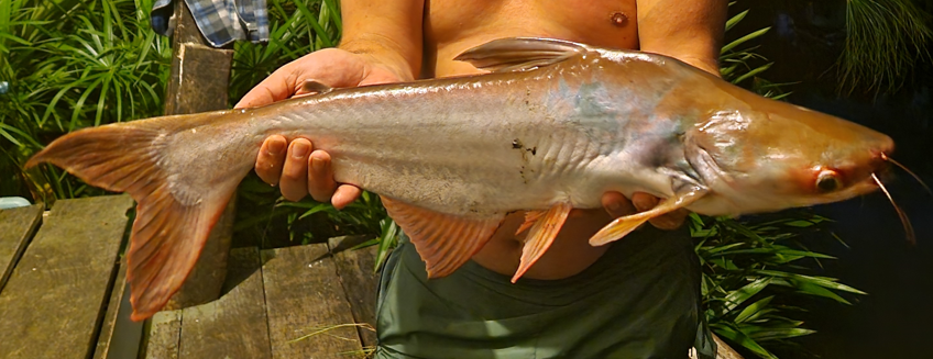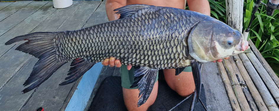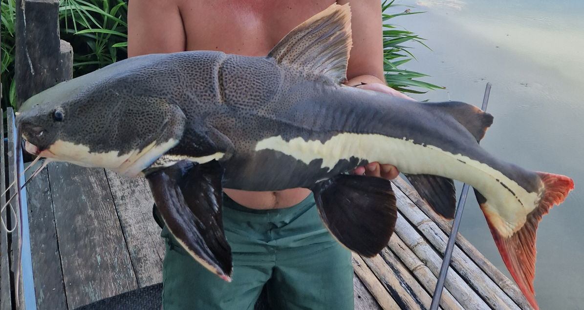 De meeste vissen die je vangt zijn tussen de 7 en 15 kg, maar dat zijn zeker niet de grootste! Het record staat op bijna 50 kilogram! In de visvijver zwemmen meer dan 25 vissoorten, waaronder Siamese karpers, verschillende soorten karpers en meervallen, alligator gar, giant featherback en snakehead om er maar een paar te noemen. Als aas wordt meestal een stukje broodkorst gebruikt, maar wij probeerden is verrassends: stukje watermeloen!